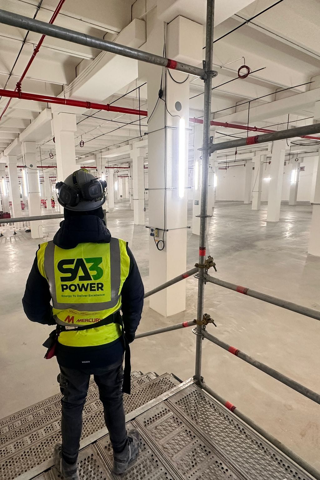 SA3 Power provides temporary site lighting and external construction lighting systems designed to meet health and safety requirements while supporting site operations during early mornings, late evenings and low-visibility conditions.